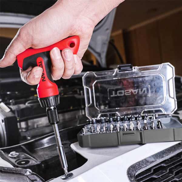 ست پیچ گوشتی و بکس 24 عددی توسن مدل T814-S24 دارای دسته ازجنس PP + TPR است . این ست 24 عددی پیچ گوشتی و بکس دارای میله رابط کربن استیل با روکش کروم مات (6 پر- 5 میلی متر) می باشد . سه حالت برای دسته T موجود در این ست 24 عددی پیچ گوشتی و بکس توسن وجود دارد که شامل چپگرد ، راستگرد و قفل کن می شود .ست 24 عددی پیچ گوشتی و بکس توسن مدل T814-S24 به همراه یک عدد رابط کمکی 10 سانتی متری ارائه می شود و همچنین دارای کیس مقاوم نیز است .
